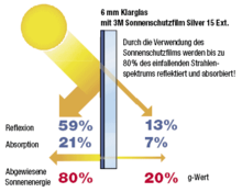 Bei der Reflektion wird die Sonnenstrahlung von der mit der Blendschutzfolie beschichteten Scheibe wieder weggeschickt.